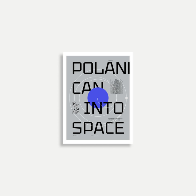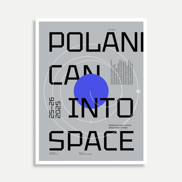 na plakacie napis "POLAND CAN INTO SPACE" z dodatkowymi napisami opisujących wylot na misję AXIOM 4 w 2025 roku z cytatem Uznańskiego-Wiśniewskiego oraz torem lotu rakiety, która dokowała na stacji kosmicznej ISS z podpisem autora, numerem serii oraz tłoczeniem